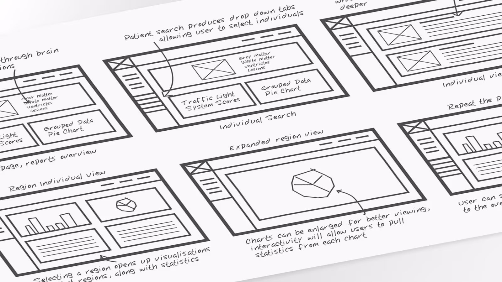 Using our interview data and user personas as guides, we did some rapid wireframing to create the structure and functionality of MRIme. We used this stage to piece together ideas that helped solve the user frustration points, as well as taking advantage of the low fidelity frames to quickly work out an optimal navigational flow.