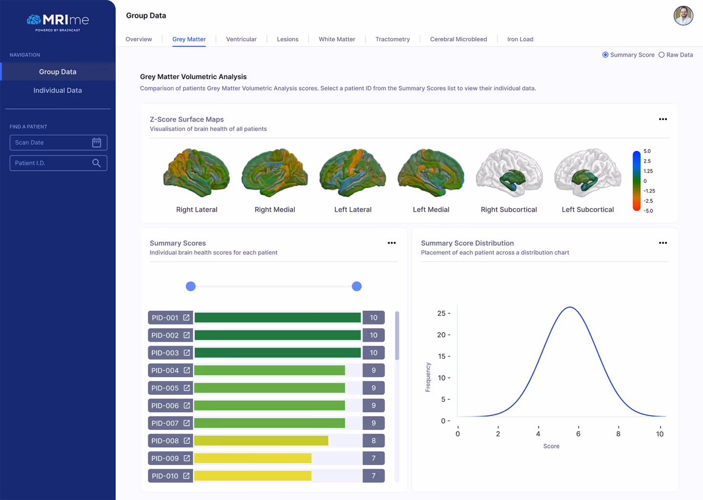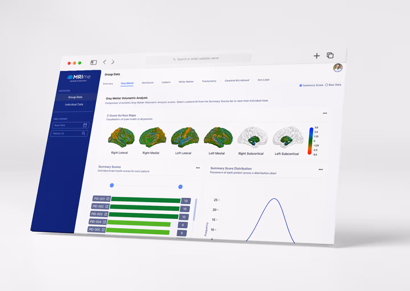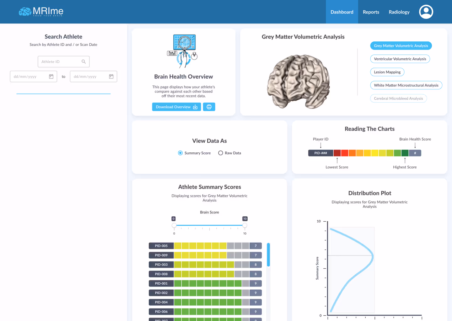 BrainCast / MRIme had developed algorithms that pull raw data from MRI scans to show important measures of brain health, aiding sports physicians in both tracking and preventing brain damage for their athletes. We needed to find a way to take this raw data and make it easy to view, understand, and compare alongside past and future datasets.