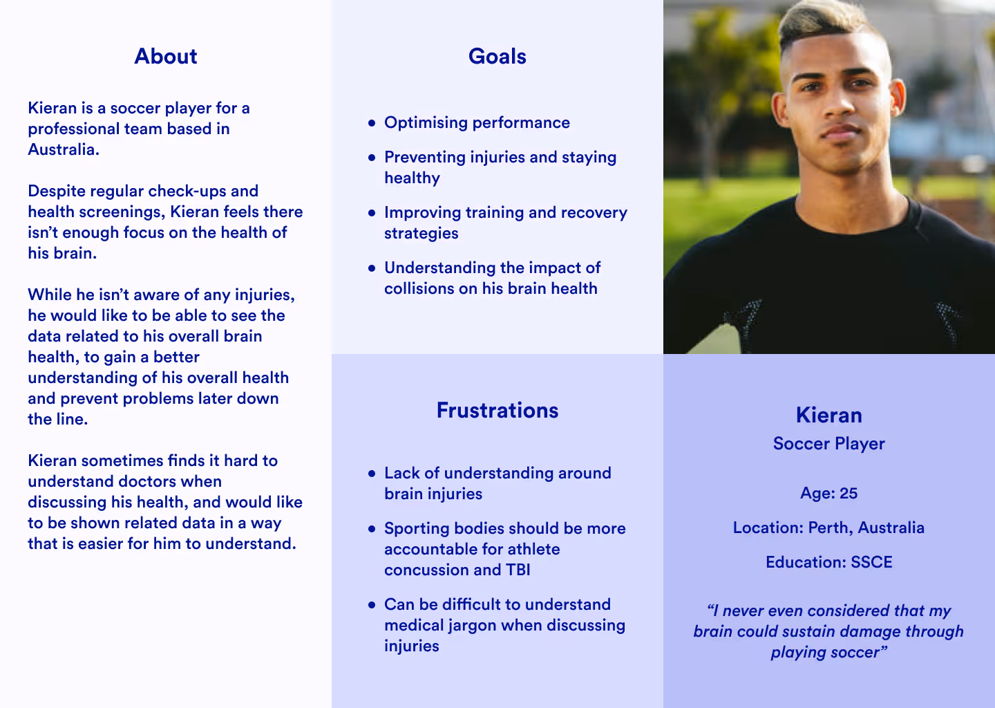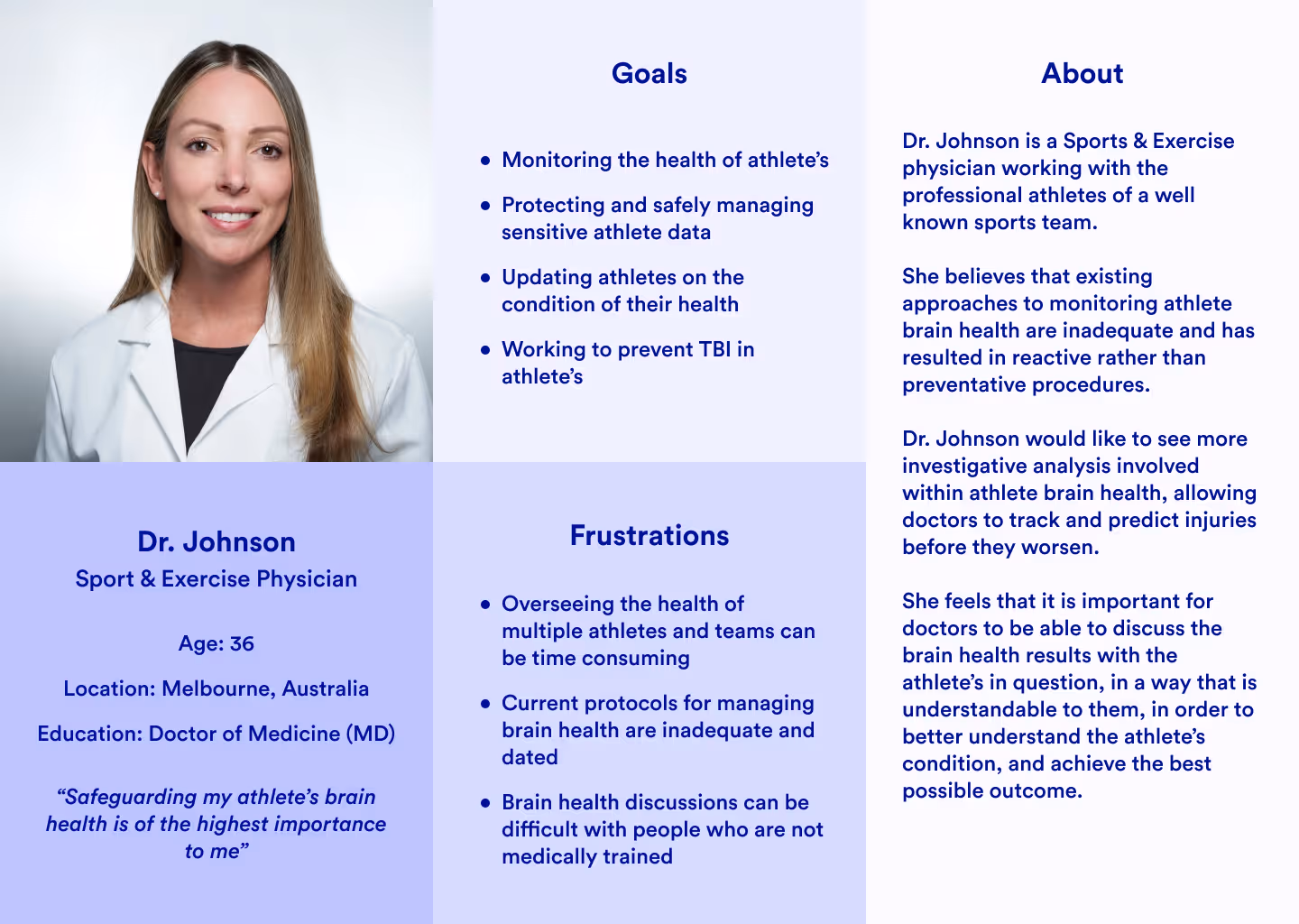 Through surveys and individual user interviews with our consultation group, we were able to find answers to questions about current protocols and challenges involved in tracking athlete brain health and making accurate diagnoses. Some of our discovery during this stage included: